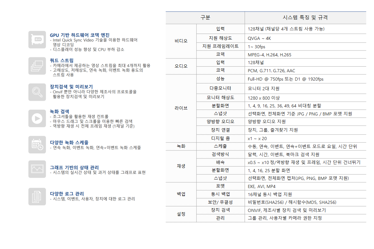 - ONVIF를 포함 제조사의 프로토콜 활용한 장치검색 및 미리보기 지원